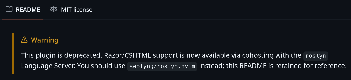 - Also updated "Neovim + C# in 2025: The Actually Improved Setup | roslyn.nvim + rzsl.nvim (from scratch)": https://git.ramboe.io/YouTube/neovim-c-the-actually-improved-configuration-2025-roslynnvim-rzslnvim/src/branch/main#lsp-for-razor-blazor-also-seblyng-roslyn-nvim-https-github-com-seblyng-roslyn-nvim-tab-readme-ov-file-razorcshtml-support