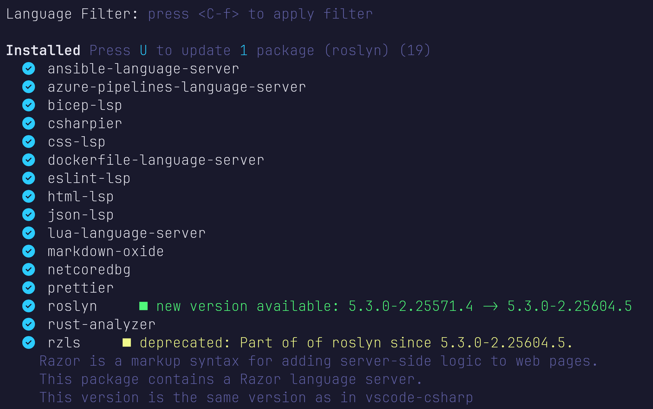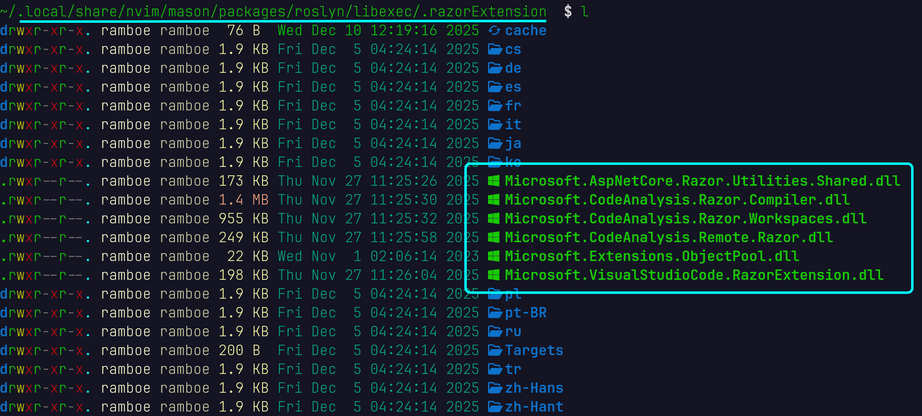 local rzls_path = vim.fn.expand(mason_root .. "/packages/roslyn/libexec/.razorExtension")