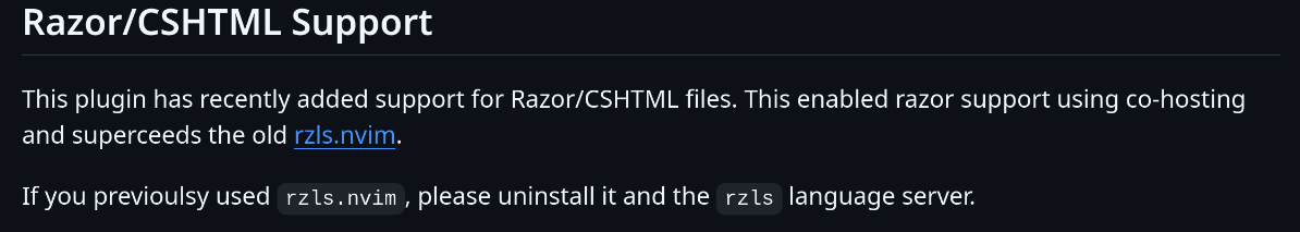 - roslyn.nvim has been updated: https://github.com/seblyng/roslyn.nvim?tab=readme-ov-file#razorcshtml-support